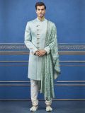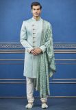 An charmingly styled Teal Blue Colour Silk Fabric Men's Indowestern With Pyjama and Quilted Work.