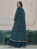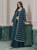 Charm all hearts wearing this teal blue color top made in chinon silk. Decorated with sequins and zari embellishment all over. Paired with matching blue color palazzo style bottom and a embroidered shrug, both made in chinon silk. Note: Some color variations may occur owing to photography causes. Up to 1 inch of measurement fluctuation is possible.