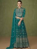 Overwhelm the audience adorning this turquoise color slitted anarkali kameez in georgette. Enhanced using stones and thread embroidery all over. Comes with a matching dupatta and bottom in georgette. Note: Accessories shown are for styling purpose only. Slight color variation may occur due to photographic reasons. The semi-stitched kameez can be customised upto 42 inches.