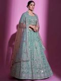 Brighten up your surroundings wearing this turquoise color lehenga in art silk. Augmented with floral themed sequins, mirror work and thread embroidered work. Comes with a matching turquoise color choli in art silk and a pink embroidered net dupatta. Note: the accessories featured are purely for fashion purposes. Due to photography reasons, some color variations may occur. The semi-stitched choli and lehenga waist may be customized up to 42 inches.