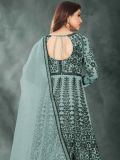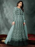 Charm all hearts adorning this turquoise color abaya style anarkali kameez in net. Furnished using thread embroidery all over. Teamed with a matching net dupatta and bottom in shantoon. Note: Accessories shown are for styling purpose only. Slight color variation may occur due to photographic reasons. The semi-stitched kameez can be customised upto 42 inches.
