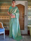 Get all dolled up as you wear this turquoise color party wear saree made in handloom silk. Augmented using zari woven patterns all over and a pallu styled with thread tassels. Comes with a matching turquoise color blouse in silk. Please keep in mind that the accessories featured are purely for fashion purposes. Due to photography reasons, some color variations may occur. The un-stitched blouse may be customized up to 42 inches.