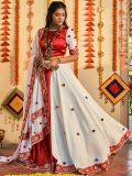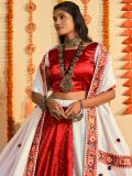 Upgrade your festive style wearing this white and red hued festive lehenga in cotton. Augmented with sparkly mirror work and thread embroidery, creating a dramatic look. Designed along with a matching red color choli in art silk and a white colored cotton dupatta, both embroidered with similar work. Please keep in mind that the accessories featured are purely for fashion purposes. Due to photography reasons, some color variations may occur. The semi-stitched choli and lehenga waist may be customized up to 42 inches.
