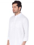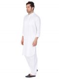 Get a squeaky clean look adorning this white color kurta made in cotton. Furnished with coller pattern and patch pockets. Paired with a white color pathani salwar in cotton. Note: Some color variations may occur owing to photography causes. Up to 1 inch of measurement fluctuation is possible.