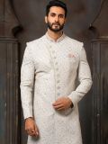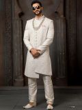 Grace up your ethnic look adorning this white color asymmetric sherwani made in art silk. Designed using thread embroidery with sequins work. As shown it comes with an white color churidaar in dupion silk. Note: Some color variations may occur owing to photography causes. Up to 1 inch of measurement fluctuation is possible.