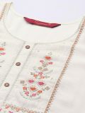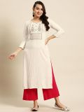 Glam up sweetly adorning this white color kurta made in rayon. Furnished with thread and sequins embroidery along the neckline crafted with 3/4th sleeves. Note: Some color variations may occur owing to photography causes. Up to 1 inch of measurement fluctuation is possible.
