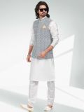 Glam up your festive look with this white color men's kurta made in art silk. Available with a grey art silk jacket enriched with thread embroidery. Comes with a matching white color churidaar in art silk. Note: Some color variations may occur owing to photography causes. Up to 1 inch of measurement fluctuation is possible.