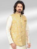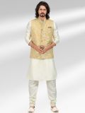 Get all the festive vibes adorning this white color kurta made in art silk. Enhanced using jacquard woven banarasi silk jacket in yellow shade. Available with matching white color churidaar in art silk. Note: Some color variations may occur owing to photography causes. Up to 1 inch of measurement fluctuation is possible.