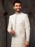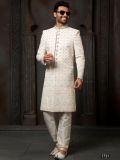 Exude timeless elegance adorning this white color sherwani made in georgette. Furnihsed using thread embroidery with sequins work. As shown it comes with an off-white color churidaar in dupion silk. Note: Some color variations may occur owing to photography causes. Up to 1 inch of measurement fluctuation is possible.