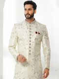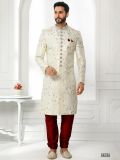Mark your appearance wearing this ivory white color sherwani made in art silk. Elevated using thread embroidery with sequins embellishment work. Comes with maroon color churidaar in dupion silk. Note: Some color variations may occur owing to photography causes. Up to 1 inch of measurement fluctuation is possible.