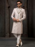 Exude regal vibes adorning this white color sherwani made in art silk. Furnished using thread embroidery with sequins work. As shown it comes with an off-white color churidaar in dupion silk. Note: Some color variations may occur owing to photography causes. Up to 1 inch of measurement fluctuation is possible.