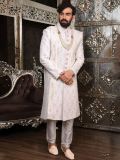 Keep shinning bright adorning this white color sherwani made in silk. Crafted using thread, zari and mirror work embroidery details all over. Comes with matching white color dhoti pants in silk. Note: Some color variations may occur owing to photography causes. Up to 1 inch of measurement fluctuation is possible.