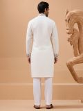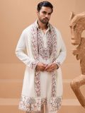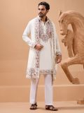 Wrap yourself in culture wearing this white color readymade kurta designed in viscose silk. Designed with sequins work embellishment and heavy floral thread work embroidery all over. Available with a matching white color embroidered stole and a white color pyjama, both made in viscose silk. Note: Some color variations may occur owing to photography causes. Up to 1 inch of measurement fluctuation is possible.