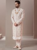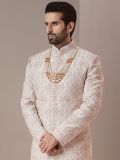 Exude glamorous sight this white color sherwani made in silk. Decorated using thread work, hand work embroidery and zardozi embellishment work. Assembled with white color churidaar in silk and a matching kurta underneath. Note: Some color variations may occur owing to photography causes. Up to 1 inch of measurement fluctuation is possible.