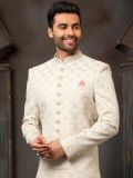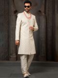 Displaying this white color sherwani made in art silk. Designed using thread embroidery with sequins work. As shown it comes with an white color churidaar in dupion silk. Note: Some color variations may occur owing to photography causes. Up to 1 inch of measurement fluctuation is possible.