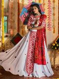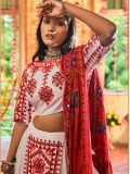 Shine brighter during any day-time soiree as you wear this white hued festive lehenga in cotton. Elevated with sparkly mirror work and thread embroidery, creating a dramatic look. Comes along with a matching white color choli in cotton and a red colored cotton dupatta, both embroidered with similar work. Please keep in mind that the accessories featured are purely for fashion purposes. Due to photography reasons, some color variations may occur. The semi-stitched choli and lehenga waist may be customized up to 42 inches.