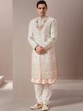Spread cheer all around as you wear this white color sherwani made in silk. Crafted using thread work, hand work embroidery and zardozi embellishment work. Teamed with white color churidaar in silk and a matching kurta underneath. Note: Some color variations may occur owing to photography causes. Up to 1 inch of measurement fluctuation is possible.