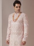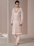 Steal the show adorning this lush white color sherwani made in silk. Decorated using thread work, hand work embroidery and zardozi embellishment work. Assembled with white color churidaar in silk and a matching kurta underneath. Note: Some color variations may occur owing to photography causes. Up to 1 inch of measurement fluctuation is possible.