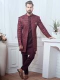 Make The Heads Turn After You Costume Up In This Kind Of A Enticing Wine Colour Imported Fabric Designer Men's Indowestern With Thread,Embroidery Work.