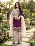 Generate a classic choice of trends wearing this wine color full sleeved readymade straight cut long kameez designed in heavy jimmy choo silk. Crafted using sequins work embellishment and heavy floral zari work embroidery all over. Available with a light beige color sharara style bottom and a beige color dupatta, both made in heavy jimmy choo silk. Note: Accessories shown are for styling purpose only. Slight color variation may occur due to photographic reasons.
