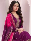 Be the best dressed diva adorning this wine color straight cut kameez in vichitra silk. Augmented using sequins and zari work embroidery all over. Comes with a wine color ombre shaded dupatta in chinon silk and a palazzo style bottom made in santoon. Note: Accessories shown are for styling purpose only. Slight color variation may occur due to photographic reasons. The semi-stitched kameez can be customised upto 42 inches.