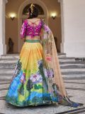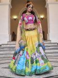 Wrap yourself in culture wearing this yellow color designer lehenga in art silk. Augmented with sequins and hand work embroidery with traditional printed pattern all over. Comes with a pink color embroidered choli in art silk and a light peach color dupatta, made in organza. Note: The accessories featured are purely for fashion purposes. Due to photography reasons, some color variations may occur. The semi-stitched choli and lehenga waist may be customized up to 42 inches.