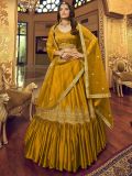 Win all the compliments wearing this mustard yellow color designer lehenga in satin. Designed with sequins and thread embroidered work. Available with a matching yellow color embroidered art silk choli and dupatta in net. Note: The accessories featured are purely for fashion purposes. Due to photography reasons, some color variations may occur. The semi-stitched choli and lehenga waist may be customized up to 42 inches.