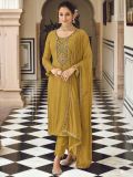 Win all hearts wearing this mustard yellow color straight cut kameez in georgette. Augmented using sequins, stones and thread embroidery all over. Teamed with a matching georgette dupatta and a matching shantoon pants. Note: Accessories shown are for styling purpose only. Slight color variation may occur due to photographic reasons. The semi-stitched kameez can be customised upto 42 inches.