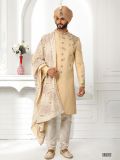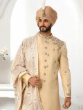 Look elegant adorning this yellow color sherwani made in art silk. Augmented using thread embroidery with stones embellishment work. Teamed with white color churidaar in dupion silk and a matching embroidered stole. Note: Some color variations may occur owing to photography causes. Up to 1 inch of measurement fluctuation is possible.