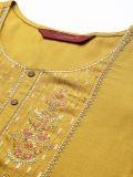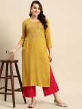 Get your hands on this mustard yellow color kurta made in rayon. Augmented with thread and sequins embroidery along the neckline crafted with 3/4th sleeves. Note: Some color variations may occur owing to photography causes. Up to 1 inch of measurement fluctuation is possible.