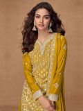 Own your effortless style as you wear this yellow color straight cut full sleeved kameez made in chinon silk. Designed using sequins and silver zari work embellishment all over. Available with a matching yellow color palazzo style bottom and a yellow color dupatta, both made in chinon silk. Note: Accessories shown are for styling purpose only. Slight color variation may occur due to photographic reasons. The semi-stitched kameez can be customised upto 42 inches.