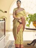 Take a ethnic look to a notch higher with this soft yellow color saree crafted in tusssar silk. Elevated using zari woven patterns, showcasing distinstive borders and pallu with threaded tassels. Teamed with a matching yellow color blouse in tussar silk. Note: The accessories featured are purely for fashion purposes. Due to photography reasons, some color variations may occur. The un-stitched blouse may be customized up to 42 inches.