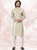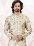 Shine brighter all day adorning this soft yellow color kurta made in banarasi silk. Elevated with a printed details all over, with potli buttons along the placket. Available with a white color churidar pants in art silk. Note: Some color variations may occur owing to photography causes. Up to 1 inch of measurement fluctuation is possible.