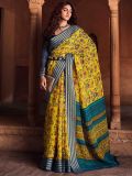 Look no less than a dream wearing this bright yellow color saree crafted in linen. Elevated using dense floral printed patterns, showcasing distinstive borders. Available with a matching blue color blouse in linen. Note: The accessories featured are purely for fashion purposes. Due to photography reasons, some color variations may occur. The un-stitched blouse may be customized up to 42 inches.