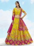 Stealing the spotlight and hearts of everyone having this yellow color designer lehenga in fancy silk. Decorated with sequins, stone work enhanced and heavy zari embellishment with floral thread embroidery all over. Available with a matching yellow color embroidered choli in silk and a multicolor embroidered dupatta, made in net. Note: The accessories featured are purely for fashion purposes. Due to photography reasons, some color variations may occur. The semi-stitched choli and lehenga waist may be customized up to 42 inches.