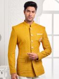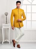 Embrace your ethnic self as you adorning this yellow color jodhpuri set. Topped with a blazer enhanced with self floral embroidery. Paired with a matching white color pant. Note: Some color variations may occur owing to photography causes. Up to 1 inch of measurement fluctuation is possible.