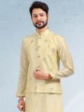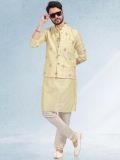 Lit your surroundings adorning this light yellow color men's kurta made in art silk. Available with a jacket enriched with thread embroidery with sequins embellishment work. Comes with a matching white color churidaar in art silk. Note: Some color variations may occur owing to photography causes. Up to 1 inch of measurement fluctuation is possible.