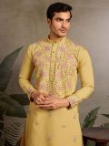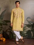 Be the best dressed diva adorning this yellow color readymade kurta designed in viscose silk. Augmented with sequins and mirror work embellishment with floral thread work embroidery all over. Comes with a off white color pyjama in made in art silk. Note: Some color variations may occur owing to photography causes. Up to 1 inch of measurement fluctuation is possible.