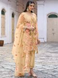 Grace up your appearance adorning this yellow color gathered kameez in net. Crafted using sequins and thread embroidery all over with stone work. Comes with an embroidered net dupatta and a matching pants in shantoon. Note: Accessories shown are for styling purpose only. Slight color variation may occur due to photographic reasons. The semi-stitched kameez can be customised upto 42 inches.