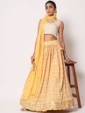 Dazzle the audience wearing this yellow color lehenga in art silk. Enhanced using prints all over with sequins and thread embroidered work. Paired with a matching white color embroidered art silk choli and yellow dupatta in georgette. Note: The accessories featured are purely for fashion purposes. Due to photography reasons, some color variations may occur. The semi-stitched choli and lehenga waist may be customized up to 42 inches.