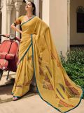 Presenting this pale yellow color saree crafted in georgette. Augmented using digitally printed geometric patterns with distinstive borders enhanced with satin lace. Available with a matching yellow color blouse in georgette. Note: The accessories featured are purely for fashion purposes. Due to photography reasons, some color variations may occur. The un-stitched blouse may be customized up to 42 inches.