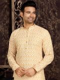 Get all the festive vibes wearing this yellow color kurta made in cotton. Decorated using chikankari work and digital prints all over. Comes with an off-white color churidaar pants in dupion sillk. Note: Some color variations may occur owing to photography causes. Up to 1 inch of measurement fluctuation is possible.