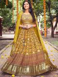 Spread your charm everywhere with this dusty yellow color printed lehenga in art silk. Paired with an art silk choli furnished with mirror work and thread embroidery and an art silk dupatta in yellow. Note: The accessories featured are purely for fashion purposes. Due to photography reasons, some color variations may occur. The semi-stitched choli and lehenga waist may be customized up to 42 inches.