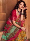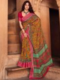 Get your hands on this mustard yellow color saree crafted in linen. Augmented using dense floral printed patterns, showcasing distinstive borders. Comes with a matching red color blouse in linen. Note: The accessories featured are purely for fashion purposes. Due to photography reasons, some color variations may occur. The un-stitched blouse may be customized up to 42 inches.