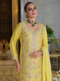 Glam up with grace with this yellow color straight cut readymade kameez made in chinon silk. Augmented using sequins and zari work with floral thread embellishment all over. Available with a matching yellow color palazzo style bottom and a yellow color dupatta, both made in chinon silk. Note: Accessories shown are for styling purpose only. Slight color variation may occur due to photographic reasons.
