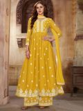 Showcasing this bright yellow color anarkali style kameez in georgette. Designed using thread embroidery all over. Paired with a matching chiffon dupatta and a palazzo in georgette. Note: Accessories shown are for styling purpose only. Slight color variation may occur due to photographic reasons. The semi-stitched kameez can be customised upto 42 inches.