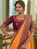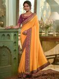 Look alive as you wear this honey yellow color saree crafted in georgette. Spruced up with thread embroidered work creating distinstive borders. Available with a contrast matching magenta color embroidered blouse in georgette. Note: The accessories featured are purely for fashion purposes. Due to photography reasons, some color variations may occur. The un-stitched blouse may be customized up to 42 inches.