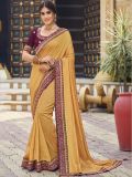 Illuminate your surroundings wearing this sandstorm yellow color saree made in georgette. Crafted using thread embroidered work creating distinstive borders. Available with a contrast matching deep purple color embroidered blouse in georgette. Note: The accessories featured are purely for fashion purposes. Due to photography reasons, some color variations may occur. The un-stitched blouse may be customized up to 42 inches.
