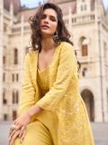 Celebrate the love commitment and style wearing this light yellow color top made in georgette. Designed with sequins, moti work embellishment and cut dana work embroidered work all over. Available with matching yellow color front open flare style embroidered shrug and a yellow color palazzo style bottom, both made in georgette. Note: Some color variations may occur owing to photography causes. Up to 1 inch of measurement fluctuation is possible.