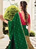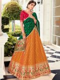 Set yourself a class apart wearing this mustard yellow color lehenga in banarasi silk. Enhanced with traditional zari woven patterns. Teamed with red color banarasi silk choli and green dupatta with similar weaves. Note: The accessories featured are purely for fashion purposes. Due to photography reasons, some color variations may occur. The semi-stitched choli and lehenga waist may be customized up to 42 inches.